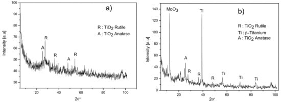 In conclusion, the samples treated in the solutions 9 and 10 show differences in surface morphology, coating thickness, and the nature of the oxides formed during anodization. While the thinner layer produced in the electrolyte of series 10 clearly shows the presence of molybdenum and titanium oxides, the thicker layer, obtained in the electrolyte 9, seems to be composed only of different TiO2 phases. It could be explained by the fact that the MoO3 phase is formed only during the initial stage of the anodic layer growth. Then, only TiO2 phases continue to grow in the anodic layer. That is probably why X-rays do not detect the presence of molybdenum oxide buried underneath the TiO2 thick layer.