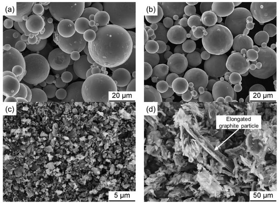 Figure 1 shows SEM micrographs of the initial powders used in the study. The powder particles of Ti-5553 and CP-Ti were almost spherical, as can be seen in Figure 1a,b. In contrast, the considerably smaller B4C particles presented in Figure 1c exhibited an angular shape, while the graphite powder consisted of large particles with a high aspect ratio between length and thickness, and fine, flake-shaped particles which were partly arranged in clusters, Figure 1d.
