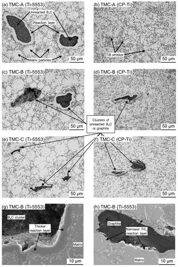 Except for TMC-A (CP-Ti), large clusters consisting of unreacted B4C and/or graphite particles appearing black-to-dark grey were present in the microstructures of the TMCs. The number of these clusters was lower for TMC-C consisting of the initial powder mixtures with the lowest contents of B4C and graphite. All of these clusters were surrounded by a reaction layer at their interfaces to the adjacent matrix particles. More microstructural details are shown at higher magnifications by the SEM-SE micrographs in Figure 3g,h for the TMC-B (Ti-5553) sample.