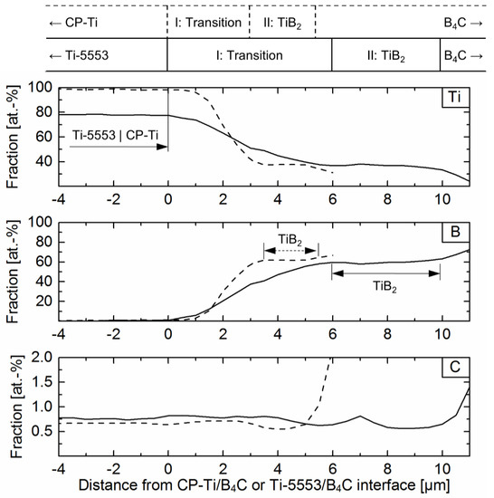 Electron probe microanalysis (EPMA) line scans of the CP-Ti/B4C (dashed line) and Ti-5553/B4C (solid line) interface showing the distributions of Ti, B and C.