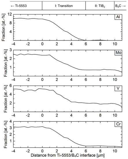 The different local distributions of the TiB and TiC particles within either the CP-Ti or the Ti-5553 matrices were not expected. Even the SEM micrographs of the initial powder mixtures were similar with respect to the arrangement of matrix, B4C and/or graphite particles. One possible reason for the concentration of TiB and TiC particles at the initial Ti-5553 particle surfaces could have been the reduced diffusivities of Ti, B or C due to the alloying elements Al, Mo, V and Cr, which were dissolved within the Ti-5553 matrix particles. Hence, diffusion experiments were carried out to provide a better understanding of the differences in reaction kinetics between CP-Ti or Ti-5553 and B4C. To this end, stacked powder layers consisting of B4C/CP-Ti and B4C/Ti-5553 were consolidated through SPS under sintering conditions identical to those used for the TMC samples. Subsequently, the elemental distributions in the region of the solid-state reactions were characterized by EPMA. It should be noted that it was not possible to perform EPMA line scans that crossed the entire reaction layer sequence, as the remaining B4C did not densify at 1200 °C and was completely lost during the sample preparation process. Nevertheless, a transition from the pure metal/alloy to TiB2 was observed for both samples—see regions (I) and (II) in Figure 4. However, the thickness of region (I), i.e., the transition between CP-Ti or Ti-5553 and TiB2, was increased from ~3 µm (B4C/CP-Ti sample) to ~6µm (B4C/Ti-5553 sample). A similar behavior was observed for the TiB2 layer thickness in region (II), where the measured values were again doubled from ~2 µm (B4C/CP-Ti sample) to ~4 µm (B4C/Ti-5553 sample). In addition, Figure 5 shows that the alloying elements Mo, V and Cr formed solid solutions within the TiB2 region, and may have caused the increase in the TiB2 layer thickness. Several studies indicate that small to medium amounts of Mo, V and Cr can be dissolved in TiB and TiB2 [37,38,39]. Unfortunately, there is a dearth of literature that would deal with the diffusion behavior within such solid solutions. However, considering the low diffusivity of boron (originating from the B4C particles) in TiB2 (D1473 K ≈ 1.2 × 10−19 m2s−1 [40]) in combination with the extended TiB2 layer thickness, it can be assumed that the reaction kinetics between B4C and Ti-5553 is more sluggish compared to CP-Ti. It may also have been possible that the mobility of the titanium diffusing from the matrix in the direction of the B4C decreased due to the partial substitution of regular Ti atoms by Mo, V and Cr within the borides. The absence of TiCy in the reaction area is associated with the significantly higher diffusivity of carbon compared to boron. According to the literature, in the early stage of B4C conversion, in particular, carbon diffuses rapidly into the titanium matrix, leaving behind an area with high boron activity. In this area, the aforementioned B4C-TiB2-TiB reaction layer sequence is then formed with respect to the decreasing boron content [19]. Further carbon diffusion within this reaction layer from the B4C in the direction of the unreacted titanium proceeds at a significantly lower rate of diffusion. However, the TiC0.5 particles nucleated in front of the reaction layer and, thus, were not detected by the EPMA measurement.