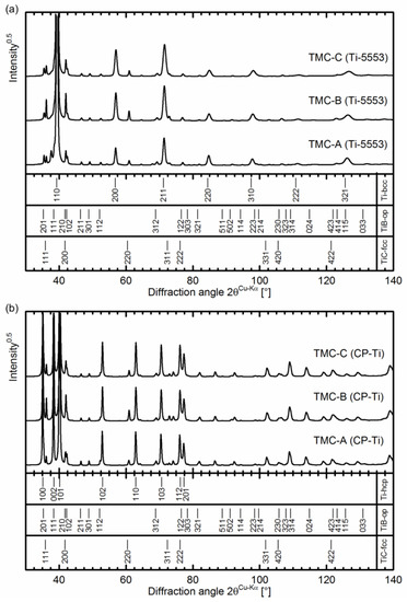 Measured XRD pattern: (a) TMCs based on a Ti-5553 matrix and (b) TMCs based on a CP-Ti matrix.
