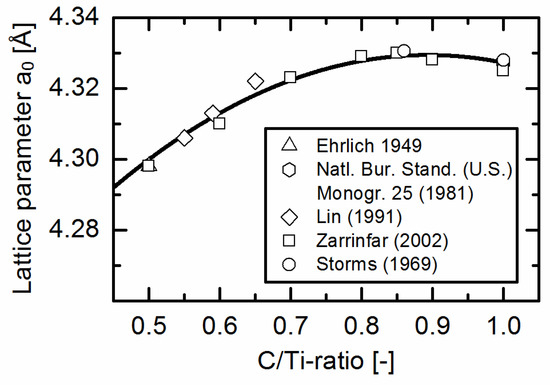 Stoichiometric dependency of the TiCy lattice parameter a0 from the molar C/Ti ratio according to literature data [25,41,42,43,44].