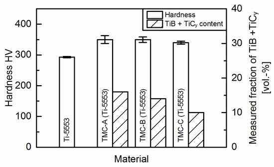 Figure 8 shows that the hardness of the TMC-A and TMC-B composites was increased by approximately 20% and for TMC-C by approx. 16% due to the reinforcing particles. Comparing TMC-A and TMC-B, it should be noted that equal values of the hardness were measured despite the latter composite having exhibited a lower total content of particle reinforcements. This can be explained by the different contributions to the macroscopic increase in hardness by the individual phases. With respect to the microhardness of the reinforcements, values reported in the literature are lower for TiB (~1800 HV0.1) than for TiC (~3200 HV0.1) [45]. For the latter, hardness did indeed exhibit a slight correlation with stoichiometry, and declined by roughly 15–20% while decreasing the C/Ti ratio to ~0.5. However, these values are still higher than the TiB values described by Lipatnikov et al. and Sundgren et al. [46,47]. The decrease in measured hardness of the composite TMC-C could be explained by the generally lower total content of particle reinforcement of only 10 vol.-%.