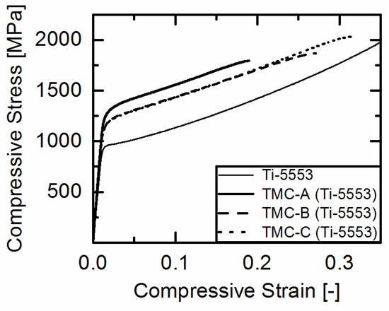 Compressive stress-strain curves of the TMCs and Ti-5553.
