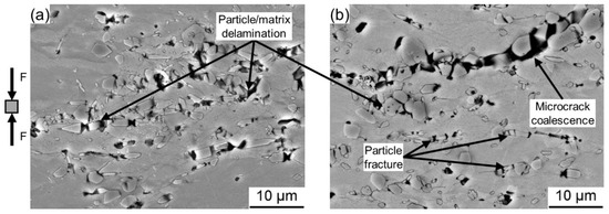 The damage evolution mechanisms were dependent on the loading conditions—i.e., either compressive or bending loading. For the former case within the tensile stress field of the samples exposed to compressive loading, particle fracture and particle delamination from the deformed matrix led to the initiation of microcracks, with failure occurring due to the coalescence of these microcracks under increasing loads. In the case of bending, only some vertically orientated microcracks within the reaction layers of incompletely reacted B4C-particle and graphite-particle clusters were found close to those sample surfaces that were exposed to the maximum tensile stresses during loading. These microcracks were predominantly orientated perpendicularly to the tensile stresses acting on the sample, and were still arrested at the interface to the Ti-5553 matrix particles. For this reason, it was assumed that further increasing the load promoted the growth of these microcracks through the matrix particles within the tensile stress field. Finally, macroscopic cracks originated suddenly from the coalescence of the vertically extending microcracks, resulting in the global fracture of the bending samples.