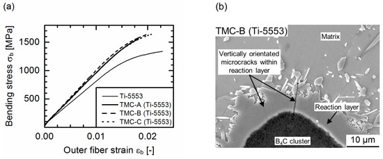 Figure 11a shows representative measured stress-strain responses (σb-εb) for the composites under 3-point bending conditions, while Table 7 shows the derived bending strengths σbf, and the outer fiber strains at failure εbf. Compared to pure Ti-5553, the particle reinforcements within the composite samples effected increases in bending strengths of ~12% (TMC-A) and ~16% (TMC-B and TMC-C), respectively. However, only the composite TMC-A exhibited a considerable decrease in ductility of ~30%, which was indicated by the lower value for εbf. Interrupted bending tests were carried out immediately below the measured bending strength of the TMCs to identify the mechanisms involved during damage evolution that led to the composites failure. The results were surprising, as no notable instances of microstructural damage were observed in the vicinity of the plane with the maximum bending moment. Only a small number of vertically orientated microcracks within the reaction layers of incompletely reacted B4C-particle and graphite-particle clusters were found close to the sample surfaces exposed to the maximum tensile stresses during bending, see Figure 11b. These microcracks were strongly oriented perpendicularly to the acting tensile stresses, and were still arrested at the interfaces to the Ti-5553 matrix particles at the moment of test interruption. It was therefore assumed that further increasing the load promoted the growth of these microcracks through the matrix particles within the tensile stress field. Finally, macroscopic cracks suddenly originated from the coalescence of the vertically extending microcracks, resulting in the global fracture of the bending sample. Thus, the bending strength of the composites was primarily related to the tensile strength of the reaction layers surrounding the B4C-particle and graphite-particle clusters. This could also be an explanation for the minor differences between the bending strengths of the composites, unlike the strengths measured in the compression tests, which showed a dependency on the total reinforcement particle content.