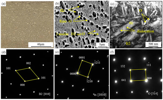 Figure 1 shows the OM, SEM, and TEM microstructures of as-rolled Ti2AlNb alloy, respectively. The white α2 phase particles were dispersedly distributed in the matrix (see Figure 1a). The microstructure of the as-rolled sheet was mainly consisted of lamellar B2/O phases, equiaxed α2 (dark), B2 (light), and rim-O phases (gray), as depicted in Figure 1b. Figure 1d–f were the electron diffraction patterns of B2, α2 and O phases, respectively, selected from Figure 1c.
