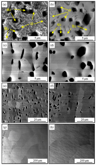 SEM microstructures of solution-treated Ti2AlNb alloy: (a) 890 °C; (b) 930 °C; (c) 950 °C; (d) 970 °C; (e) 990 °C; (f) 1030 °C; (g) 1050 °C; and (h) 1090 °C.