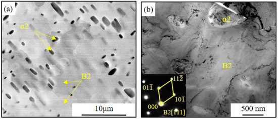 Microstructure of the solution-treated Ti–19Al–23Nb–0.5Mo alloy (980 °C/3 h): (a) SEM microstructure, (b) TEM micrograph of α2 phase and B2 phase.