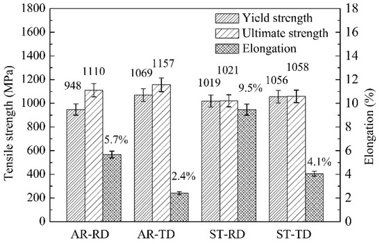 Tensile strength and elongation in two directions (RD and TD) of AR (as-rolled) and ST (solution-treated) alloy.