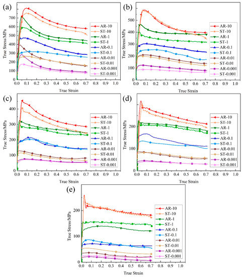Typical stress-strain curves at different temperatures and strain rates of as-rolled (AR) and solution-treated (ST) Ti2AlNb alloy, (a) 900 °C, (b) 950 °C, (c) 1000 °C, (d) 1050 °C, and (e) 1100 °C.