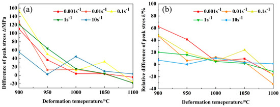 The peak stress and strain characterization at different temperatures and strain rates of as-rolled and solution-treated alloy: (a) difference of peak stress (, is the difference of peak stress, is the peak stress of as-rolled alloy, and is the peak stress of solution-treated alloy), (b) Relative difference of peak stress (, is the relative difference of peak stress, is the peak stress of as-cast alloy, and is the peak stress of solution treated alloy).