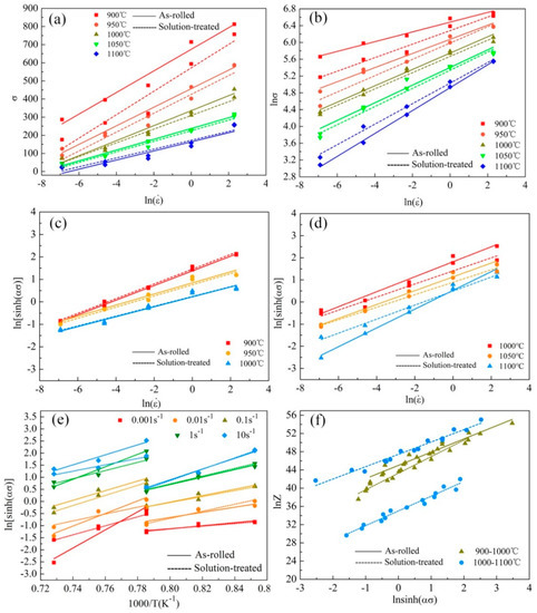 The α values could be calculated through linear fitting of the relationships of and , as shown in Figure 7a,b. Subsequently, the deformation activation energy could be obtained through linear fitting of the curves of and , as shown in Figure 7c–e. Besides, the stress constant n could be calculated according to the curves of shown in Figure 7f. In addition, the correlation coefficients of as-rolled and solution-treated alloys for the linear regression of lnZ and during 900–1000 °C were 0.9878 and 0.98511, respectively, which reached 0.9934 and 0.9944, respectively, during 1000–1100 °C, indicating the reliability of kinetic analysis of the Ti2AlNb alloy by hyperbolic sine law.