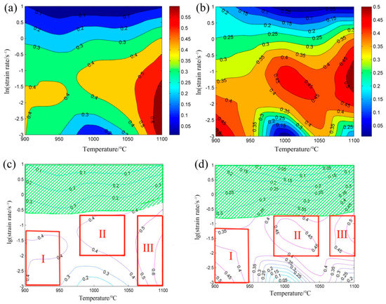 Processing maps of as-rolled and solution-treated Ti2AlNb alloy: (a) power dissipation map of as-rolled alloy; (b) power dissipation map of solution-treated alloy; (c) processing map of as-rolled alloy; and (d) processing map of solution-treated alloy.