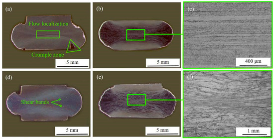 The processing map exhibited a large domain of flow instability at the strain rates higher than 1.0 s−1, which was probably caused by the occurrence of adiabatic shear bands or localized plastic flow [25,31,32]. Figure 9a,d show the macrostructures of hot compressed specimens of as-rolled and solution-treated alloy at 900 °C and 10 s−1, respectively. Figure 9b,f show the macrostructures of as-rolled and solution-treated alloy at 1100 °C and 10 s−1, respectively. It can be seen from Figure 9d that adiabatic shear bands were present at an angle of 45° to the compressive axis, which was often observed in titanium alloys at low temperatures and high strain rates. In general, shear bands were easily observed due to the adiabatic heating induced by lower thermal conductivity of titanium based alloy relative to other metal materials. The deformation heat generated during hot deformation with higher strain rate could not be released in time, resulting in localized temperature rising. Prasad et al. [25] also suggested that titanium alloys exhibit flow instability due to the formation adiabatic shear bands at high strain rates. Clearly, it can be observed that flow localization occurred in Figure 9a,b,d,e, which indicates that the Ti–19Al–23Nb–0.5Mo alloy was very sensitive to the deformation temperature and strain rate. Since flow instability should be avoided during hot working, it is necessary to control deformation temperatures and strain rates during hot working of the present alloy.