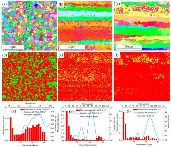 When deformed under 1100 °C and 0.1 s−1, the recrystallized grains grew obviously (see Figure 10c and Figure 11c) and phase could not be found (see Figure 10f and Figure 11f) both in as-rolled and solution-treated alloys. In addition, small amounts of residual O phase could be found in Figure 10f, which disappeared completely in Figure 11f. Similarly, the pinning effect of O phase limited the coarsening of B2 grains, which led to smaller grain size (88 μm) in as-rolled alloy than solution-treated alloy (95 μm), as illustrated in Figure 10i and Figure 11i.
