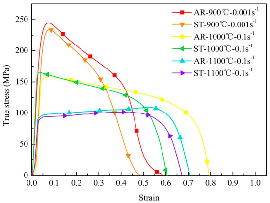 Under the temperature range of 900–1050 °C, the as-rolled alloy showed higher peak flow stress compared with the solution-treated alloy, as shown in Figure 6. However, the difference of peak stress reduced with the increasing of deformation temperature. The possible reason is that the reduction of dispersively distributed fine lamellar O phase and α2 phase accelerated the decreasing of flow stress of as-rolled alloy with the increase of deformation temperature, which led to the reduction of peak stress difference between as-rolled and solution-treated alloy. When the temperature increased to 1100 °C, both the secondary O phase and α2 phase disappeared in the B2 matrix, thus the solution-treated alloy even exhibited a higher peak flow stress relative to the as-rolled alloy, as shown in Figure 5e and Figure 6. It is well known that grain boundary slip was the main deformation mode of metals at high temperature [16,17]. In this study, the grain size of as-rolled and solution-treated Ti2AlNb alloy under 1100 °C was 88 μm and 95 μm, respectively. The larger grain size of solution-treated Ti2AlNb alloy should result in less internal grain boundaries, which was not conducive to plastic deformation and thus led to higher flow stress of solution-treated alloy compared to as-rolled alloy.
