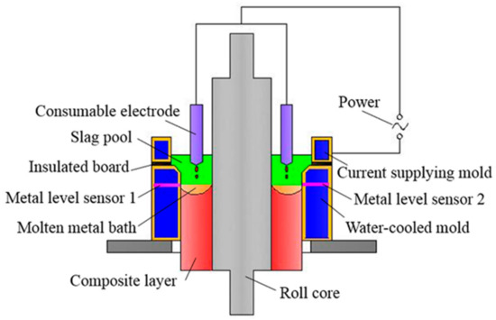 In the present study, an improved electroslag cladding method with the electrode—current supplying mold conductive circuit [8] was used to manufacture the HSS/DCI composite roll. Schematic diagram of the new improved electroslag cladding method is shown in Figure 1. It mainly includes a T-type mold, consumable electrodes, slag bath, composite layer, roll core, current supplying mold and a pair of metal level sensors. The upper part of the T-type mold is a Φ420 mm current supplying mold, while solidification of the molten steel used as the composite layer occurs in the lower Φ350 mm water-cooled mold.