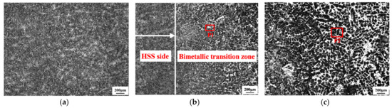 As a partial melting phenomenon of the roll core surface has occurred during the electroslag cladding process, the combined effects of the melting and element diffusion occurs in the bimetallic bonding interface. With the combined effects, different microstructures are formed as shown in Figure 7. However, the measurement area moves 3 mm towards the HSS side when compared with that in the Figure 6.