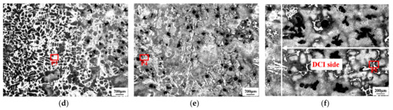 Though the Figure 6, it can be seen that there are no defects such as slag inclusion and porosity in the bonding interface and a good metallurgical bonding status is achieved. There also exists an obvious transition layer between HSS and DCI and in where the graphite morphology shows obvious changes. At the DCI side, a nonuniform distribution with a poor sphericity, big size, and flowering morphology of the graphite is obtained as shown in Figure 6e. Near the DCI side, the flowering graphite gradually disappeared and turned into spherical graphite with a relatively good sphericity and uniform distribution as shown in Figure 6d. During the transition from DCI to HSS side, the graphite morphology changes again and transforms into fine and dispersed graphite particles as shown in Figure 6b,c. Near the HSS side, the graphite particles gradually disappears.