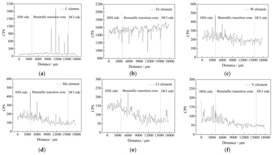 Sample of the bimetallic bonding interface taken from the B1 position in Figure 2 was used to measure the elements distribution of C, Fe, W, Mo, Cr, and V in the bimetallic bonding interface through a line scan analysis. In order to make it be corresponding to the microstructure in Figure 7, width of the tested line for line scan analysis was same as that from Figure 7a–f (a region with continuous change) and the analysis results were shown in Figure 9. The vertical lines for the position of the bimetallic transition zone are consistent with that in Figure 7b,f.