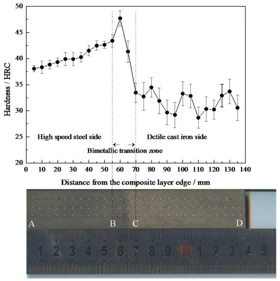 From Figure 10, it can be seen that, the hardness value increases from 38.1 HRC to 43.4 HRC at the HSS side, this is due to the fact that as the distance from the bimetallic transition zone decreases, the C element diffusion from the DCI side becomes more conspicuously (as the carbon atom is a interstitial atom and the atomic radius is very small, the diffusion speed is fast). With the increase of C content, it is easy to form high hardness MC type carbide with the other alloying elements such as V, W, Mo, and Cr in high speed steel. So, the hardness value shows a trend of gradual increase when it moves from point A to point B.