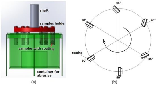 The erosive-wear resistance of the coatings was evaluated by a dry-pot wear test on the basis of the relative motion of the coating against an abrasive stored in a pin mill. The erosive dry-pot wear test was carried out on a laboratory test device (Figure 1), whereby the coating mounted on a driven holder was milled by an abrasive poured into a container with sample angles of 45° and 90°. The abrasive and conditions used were as follows: brown corundum; particle size: 0.75 mm; duration of the test: 8 h; sample speed: 1.74 m·s−1; depth of coating immersion in abrasive: 60 mm; wear track (8 h): 50 km.