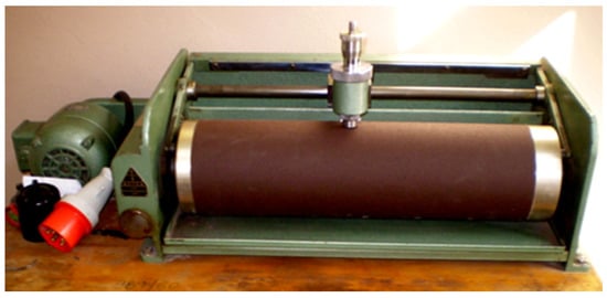 The abrasive wear test using abrasive cloth was realized on an APGi laboratory device, VEB, Leipzig, Germany (Figure 2). Abrasive cloth with grit sizes of #80 and #120 were used (load of 10 N, circumferential velocity of 0.33 m·s−1, and wear track of 40 m).