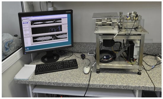 The adhesive wear of the coatings was evaluated by a sliding wear test (pin-on-disc) according to ISO 20808: 2016. The principle of the test is the contact and relative motion of a tungsten carbide ball with a coating, fixed on a rotating disk. The experiment was carried out on a prototype of a unique device for testing tribo-corrosive properties (Figure 3). This device allows for performing experiments in dry friction as well as corrosive environments. The adhesive wear test was performed in dry friction in atmosphere (ATM) and also in a 1 mol solution of NaCl (surface of the coatings: as-sprayed; load force: 1.5 N; linear speed: 0.02 m·s−1; stop condition: 60 min (track length: 72 m)).