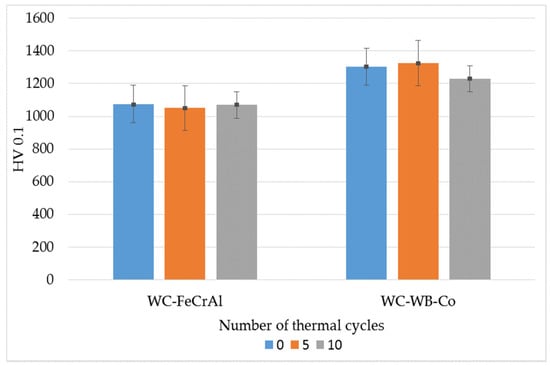 The values of the microhardness of the WC-FeCrAl coating ranged from 1050 to 1069 HV 0.1, and the microhardness values of the WC-WB-Co coating varied from 1221 to 1325 HV 0.1. Significant changes in the microhardness values of the coatings values were not observed. Because of the heterogeneous structure of the coatings and their high hardness, the variance in the hardness values of the measurements was relatively wide; therefore the changes in hardness in relation to the number of thermal cycles could be considered negligible.