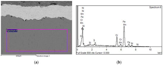 (a) SEM image of base material and coating; (b) EDS spectrum of selected area of base material.