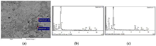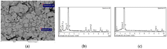 (a) SEM image of WC-FeCrAl coating; (b) EDS spectrum of FeCrAl matrix; (c) EDS spectrum of WC particle.