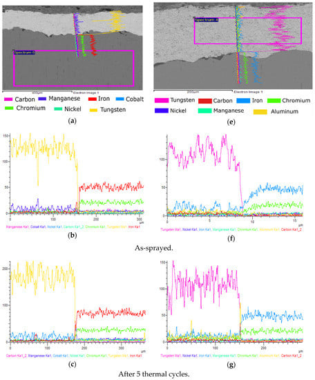 Figure 8 shows the EDX measurement results, which analyzed the distribution of coatings’ main constituents at the substrate–coating interface. The scan position is marked by a straight line. The results showed that there were no changes in the chemical compositions of the coatings, as evident from EDX line scans, caused by thermal cyclic load.