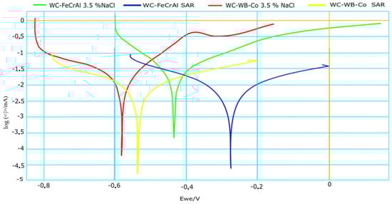 From the results, it can be concluded that the lowest current density was recorded for the WC-FeCrAl coating exposed in SAR solution. The highest current density was recorded for the WC-WB-Co coating exposed to 3.5% NaCl solution. Regarding the solution used, a higher corrosion aggressivity was shown in the 3.5% NaCl solution compared to SAR. Higher corrosion resistance in both testing solutions were shown for the WC-FeCrAl coating.