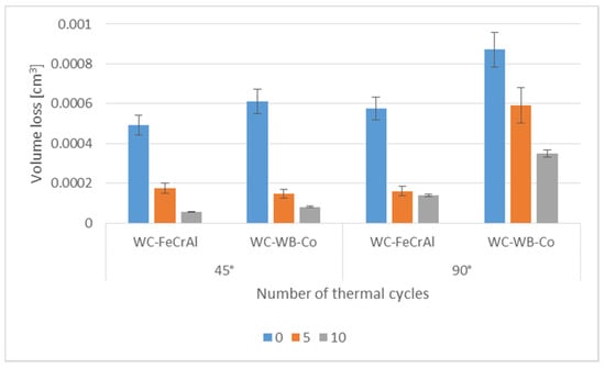 Figure 10 shows the volume loss of the coatings after the dry-pot wear test with sample angles of 45° and 90°, depending on the number of thermal cycles.
