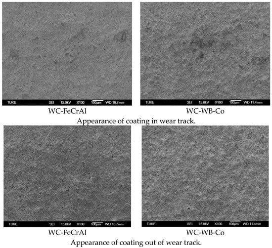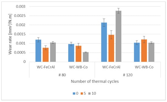 From Figure 11, it can be stated that a higher wear resistance was shown by the WC-WB-Co coating. Differences in the wear rate using a smaller abrasive grit size (#120) were more pronounced. The smaller grit size of the abrasive (#120) was closer to the size of the WC particles and more intensively removed them, compared to the large abrasive grit size. Additionally, the number of grains in contact with the coating along the wear track was larger using the smaller grit size, and therefore differences between the coatings became more pronounced.