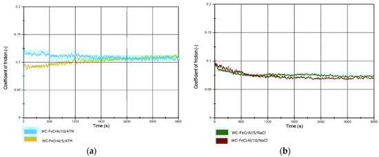 WC-FeCrAl coating: (a) friction coefficient in dry friction, and (b) friction coefficient in sodium chloride (NaCl) solution.