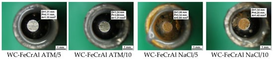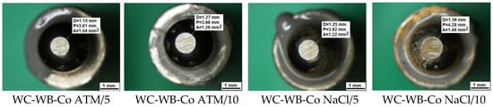 The friction coefficient in dry friction had a slightly increasing trend in both evaluated coatings, reaching a value of just above 0.1. In the corrosive solution, lower friction-coefficient values were measured with a decreasing tendency and steadied just below 0.1. In all cases, the pin was preferably worn, but the coating remained intact. The wear of the balls, expressed by the flat worn area, is given in Table 7.