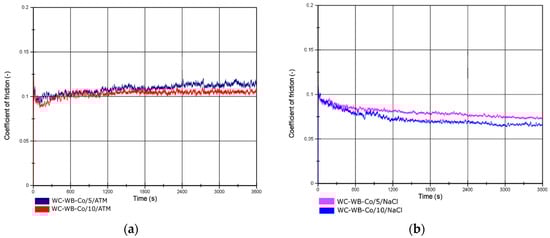 WC-WB-Co coating: (a) friction coefficient in dry friction, and (b) friction coefficient in sodium chloride (NaCl) solution.