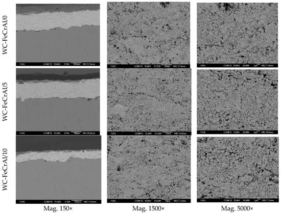 Figure 17 and Figure 18 show the WC-FeCrAl and WC-WB-Co coatings’ microstructures at various magnifications and numbers of thermal cycles.