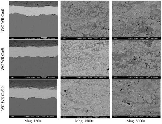Bouaricha et al. [] investigated the WC-WB-Co coating from the point of view of its microstructure, phase transformation, and wear properties. They found that a harder Co matrix was composed of amorphous/nanocrystalline W-Co-B phases and exhibited good adhesion between the matrix and tungsten carbides. This fact is considered to be the source of better properties at higher temperatures.