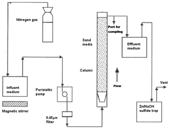 The influent was pumped from the reservoir tank to the inlet of the reactor by means of a pre-calibrated variable speed peristaltic pump at a flow rate of 0.006–0.15 L/h (approximately 0.5–10 pore volumes per day). Inert gas (N2 or CO2) is continuously purged through the influent reservoir to lower the oxygen content of the influent solution and satisfy the anaerobic conditions during column experiments. A series of preliminary experiments were conducted to determine the operability of column apparatus. For these preliminary experiments inorganic materials were used as PRB active treatment medium. The stability of the equipment was demonstrated for all preliminary tests.