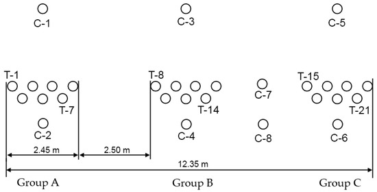 Scheme of PRB holes. Group A—cylinders filled with inorganic active filling; Group B—with organic-inorganic active filling; Group C—with organic active filling.