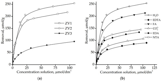 This is due to the changes in uranium speciation after the addition of carbonate and other complexing agents. One of the important uranium fixation mechanisms is sorption. As shown in the speciation diagrams in [52], positively charged uranyl () species dominate under CO2-free conditions, while solutions in the presence of carbonate contain predominantly negatively charged , , or uncharged UO2CO3 complexes, with rather weak sorption properties. The same situation exists for other ligands [47,53]. Clearly, the lowest uranium removal from solution occurred with strong ligands such as EDTA and and the highest with the weaker ligand FA.