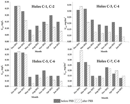 The greatest decrease was observed in monitoring holes C-1 (Figure 7) and C-2, which are located near PRB cylinders filled with inorganic filling and in monitoring holes C-3 (Figure 7) and C-4 which are located near PRB cylinders filled with organic-inorganic filling. Smaller decreases were observed after flow through cylinders with organic filling (as indicated by data from monitoring holes C-5 (Figure 7) and C-6) because of the clayey and sandy character of the soil near the uranium mine TSF and the low content of microorganisms from the indigenous mine consortium.