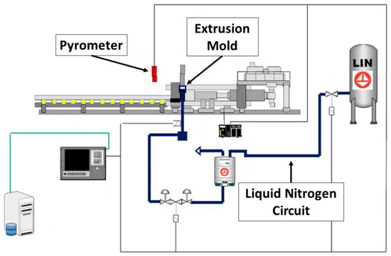 The new liquid nitrogen cooling technology, used directly in the matrix, allows the exploitation not only of the nitrogen inertizing effect, but also of its use as coolant, providing a much broader range of benefits. The liquid nitrogen enters into the channels inside the matrix at a temperature of −196 °C and, during evaporation, it cools the mold. After the change in state, the gas creates an inert atmosphere, which inhibits the formation of oxides. The most significant advantage of this process, which justifies the higher installation and operating costs, is the increase in productivity due to the decrease in heat generation during extrusion. Indeed, the modern liquid nitrogen extrusion mold cooling systems optimize the consumption of nitrogen and guarantee sufficiently precise control over the whole process [3,4,11,12,13]. A schematic sketch of this technology is reported in Figure 1.