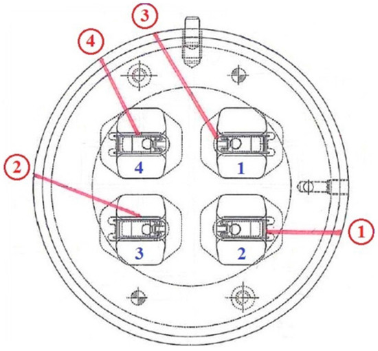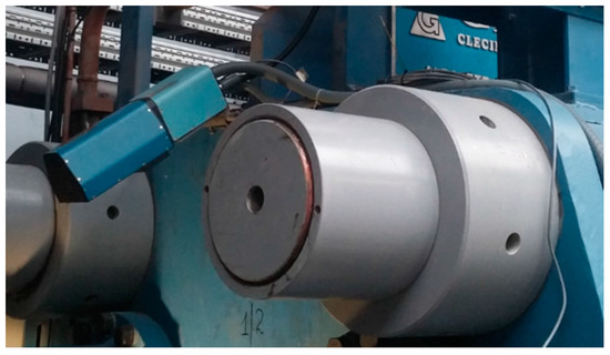 The thermocouples used in this work were Chromel/Alumel (K) thermocouples with mineral oxide insulation and Inconel 600 as the sheath material. The sheath had a 3.2 mm diameter and 2000 mm length. The laser pyrometer temperature method measured the emitted thermal radiation, which directly corresponded to the temperature and surface emissivity of the target. In detail, the pyrometer sensors detected the amount of infrared radiation emitted by the measured object. The pyrometers were installed in front of the exit of the extrusion dye (Figure 4).