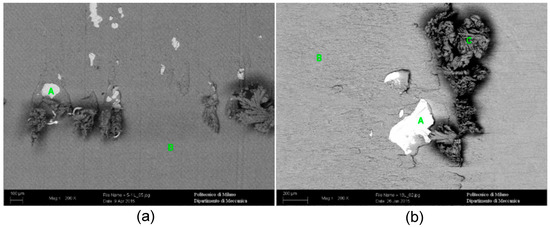 Therefore, the analyzed defects can be classified as pick-up and dye pick-up. Pick-ups (Figure 5a—point C) are intermittent score lines of varying lengths, which end in a fleck of aluminum debris. They can be easily identified by their chemical composition, which is the same as that of the extruded aluminum alloy [23]. The exogenous deposited layers were composed by a different material and they can be recognized as dye pick-up (Figure 5b—point A, Figure 5a—point A), which are particles worn-out of the extrusion dye and deposited on the semi-product surface [23,24,25,26,27].