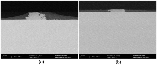 Moreover, the microstructures appeared homogeneous across the junction area sections (Figure 8a). Thus, no relationship between the microstructure and the surface defects was identified. Moreover, no differences in the morphologies of the crystal grains were detected; all the junction areas of the tested specimens featured coarse equiaxial microstructures, without been affected by any variations in the working parameters.